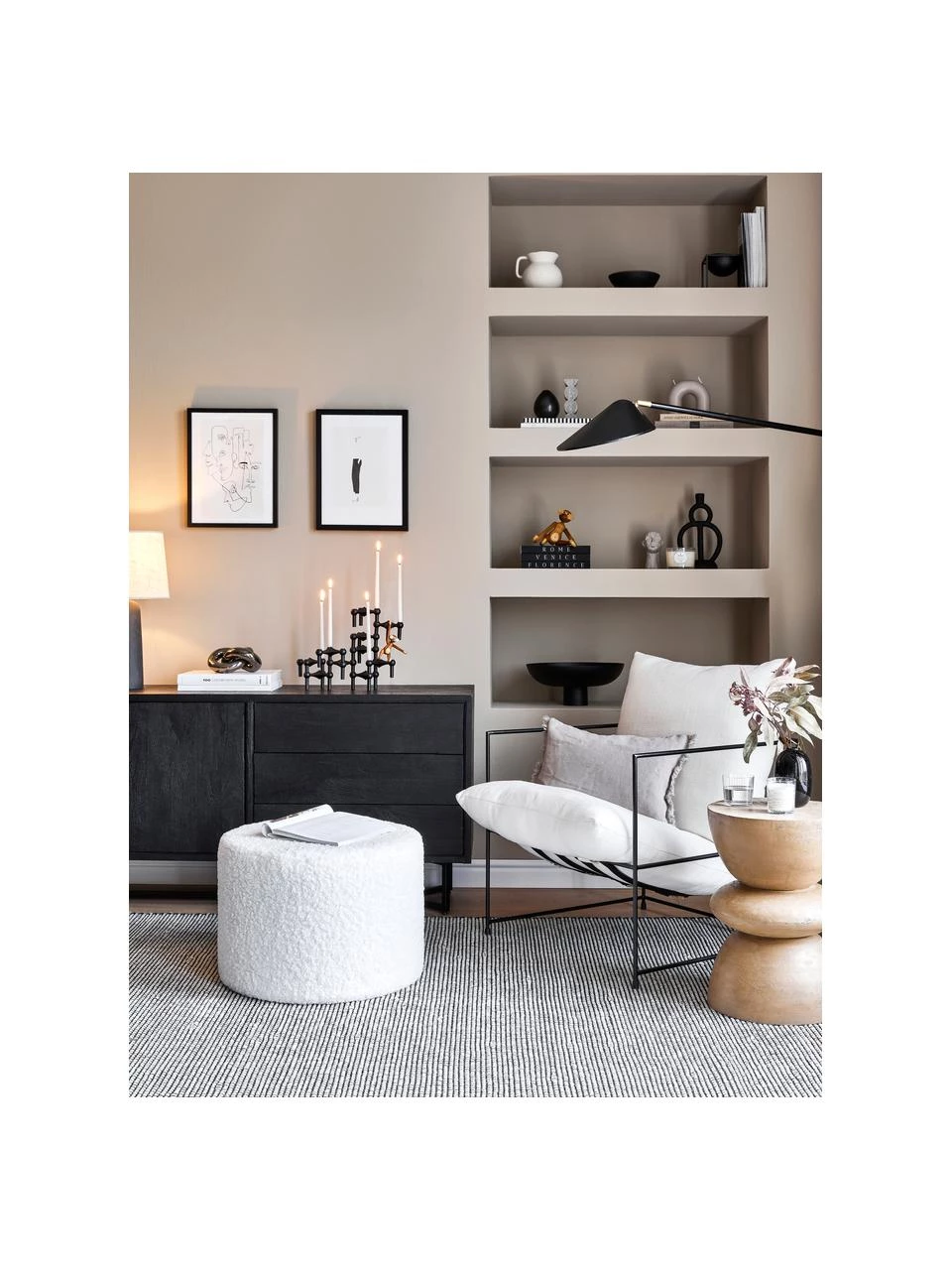 Bei WestwingNow finden Sie passende Tabletts mit denen Sie den Hocker in einen Couchtisch verwandeln können.